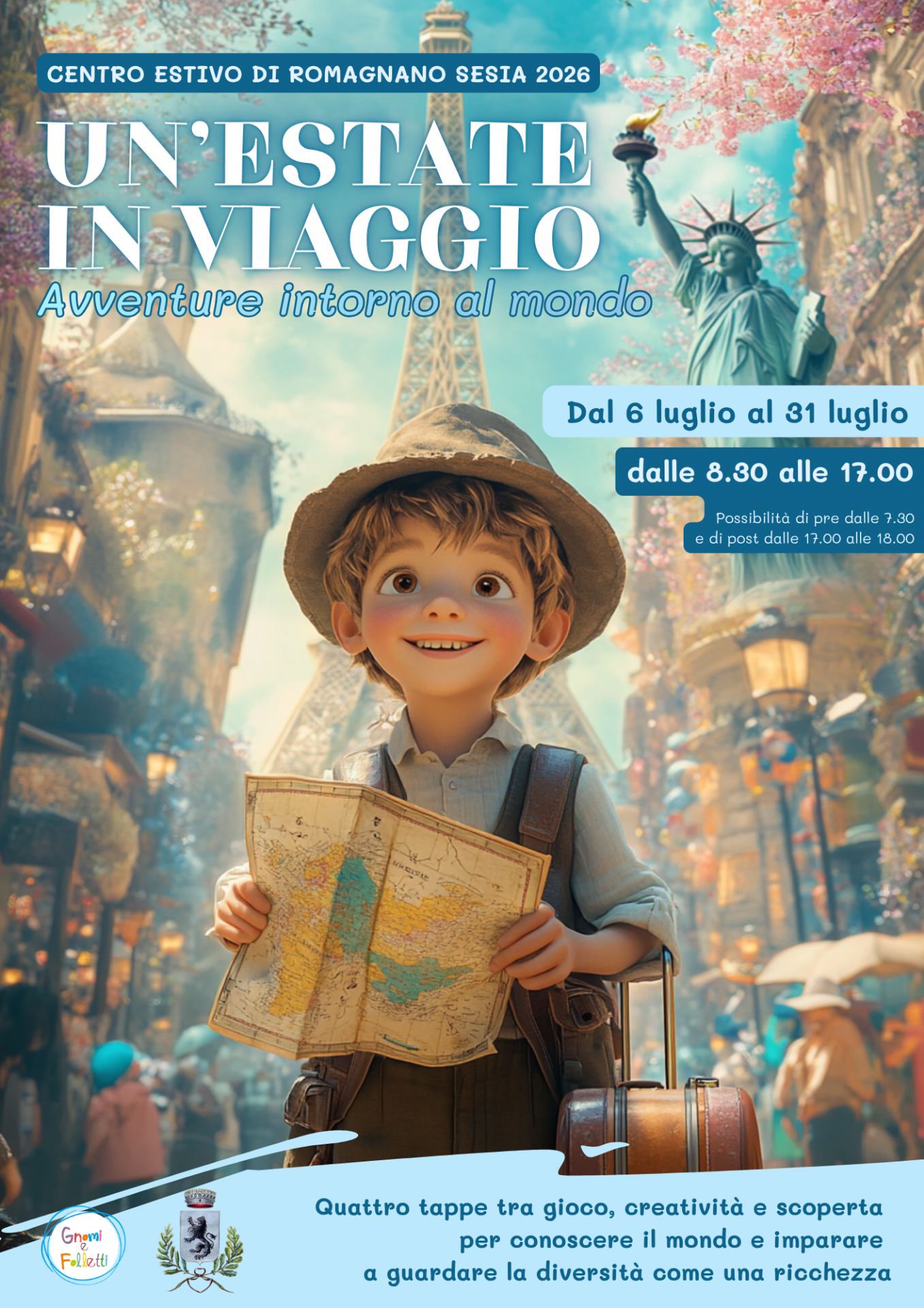 Dal 6 luglio al 31 luglio 2026 si svolgerà presso il Comune di Romagnao Sesia il centro estivo "Un'estate in viaggio, avventure intorno al mondo!", in collaborazione con la Cooperativa "Gnomi e Folletti".