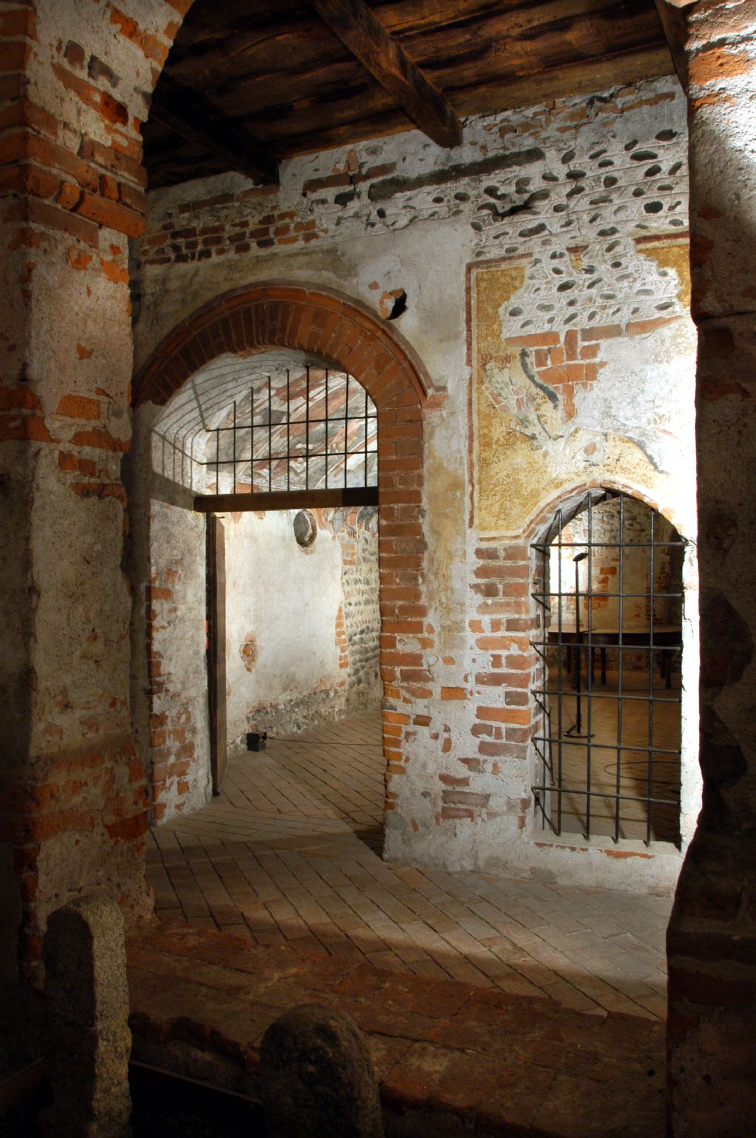 Il locale è coperto da una volta a botte in mattoni; i muri sono costruiti con ciottoli di fiume legati con malta disposti in file alternate "a spina di pesce", ma non mancano inserti diversi, segno di avvenute trasformazioni. Nulla si sa della sua destinazione originaria, anche se la rilevante presenza di simboli araldici, le eroiche vicende narrate negli affreschi e l'assenza di riferimenti certi al rito religioso farebbero pensare o ad un uso del tutto privato o anche ad un uso collettivo e pubblico, ma di rappresentanza o di riunione, più che liturgico.