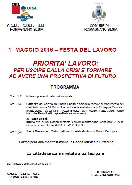 Ore 10,30 In Piazza Libertà: Santa Messa per i Caduti del Lavoro celebrata da don Gianni Remogna