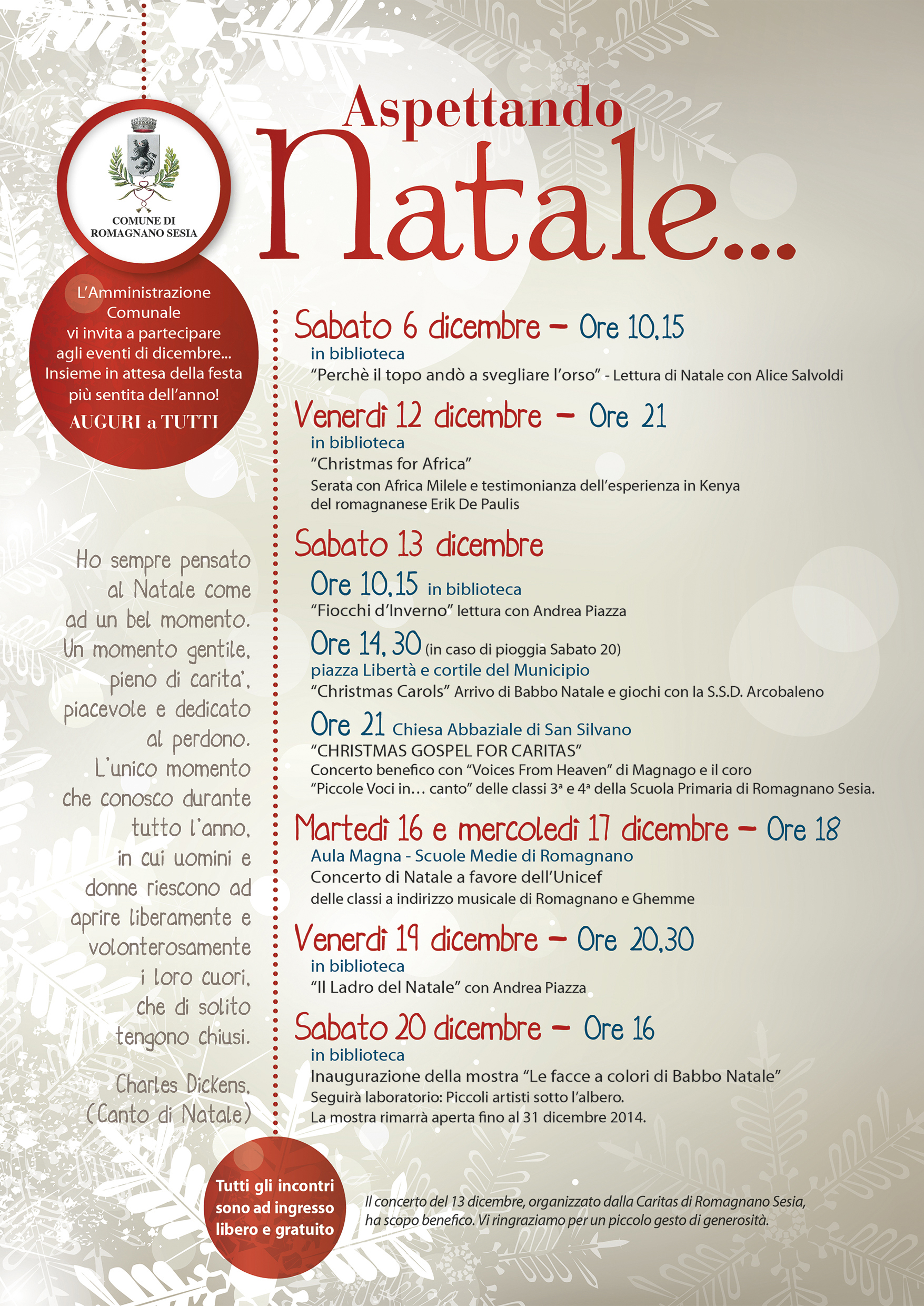 Si comincia con questo sabato 6 dicembre alle ore 10.15 in biblioteca con “Perché il topo andò a svegliare l’orso” lettura di Natale con Alice Salvoldi. Una serata di testimonianza quella di venerdì 12 dicembre alle 21 in biblioteca con “Christmas for Africa”. Il romagnanese Erik De Paulis racconterà la sua esperienza missionaria in Kenya con l’associazione Africa Milele. Ricca la giornata di sabato 13. Si comincia alle 10.15 in biblioteca con “Fiocchi d’Inverno” lettura animata per bambini con Andrea Piazza. Nel pomeriggio alle 14.30 “Christmas Carols”. In Municipio arriverà Babbo Natale che incontrerà tutti i bambini, mentre in piazza Libertà verranno proposti diversi giochi con l’animazione della S.S.D. Arcobaleno e verrà distribuito a tutti il panettone. Intorno le 17 la fiaccolata natalizia. Alla sera alle 21 in chiesa parrocchiale “Christmas Gospel for Caritas”, concerto natalizio con “Voices From Heaven” di Magnago (MI) e il coro “Piccole Voci in… canto” delle classi 3° e 4° della Scuola Primaria di Romagnano Sesia. Le offerte raccolte nel corso della serata serviranno a finanziare i progetti della Caritas Parrocchiale: "supporto allo studio" e "emergenza bollette".