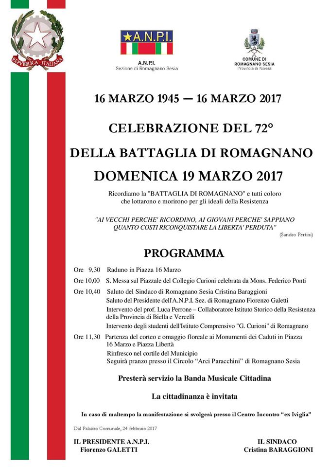 ore 10:40 saluto del Sindaco di Romagnano Sesia Cristina Baraggioni, saluto del presidente dell'ANPI sez. di Romagnano S. Fiorenzo Galetti. Intervento del prof. Luca Perrone - collaboratore dell'Istituto Storico della Resistenza della Provincia di Biella e Vercelli. Intervento degli studenti dell'Istituto Comprensivo "G. Curioni". di Romagnano Sesia.