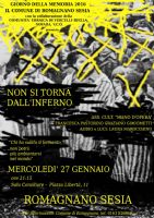 Mercoledì 27 gennaio alle ore 21:15 nella Sala Consiliare del Comune di Romagnano, in occasione della Giornata della Memoria, andrà in scena lo spettacolo teatrale “Non si torna dall'Inferno” di e con Francesca Pastorino e Graziano Giacometti dell'Ass.Cult. “Mano d'Opera”. Ingresso gratuito