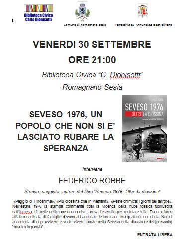 «Peggio di Hiroshima». «Più diossina che in Vietnam». «Peste chimica: i giorni del terrore». Nell’estate 1976 la stampa commenta così la vicenda della nube tossica fuoriuscita dall’Icmesa. Lì, nelle settimane successive, arriva l’esercito per recintare tutto. Da un giorno all'altro centinaia di famiglie devono abbandonare le loro case. Ma qualcuno non ci sta. Non si accontenta di sopravvivere e vuole vivere, anche nella Seveso della diossina e del (presunto) “mostro in pancia”. Venerdì 30 settembre in biblioteca a Romagnano Sesia alle ore 21 incontro libero e gratuito con Federico Robbe autore del libro "Seveso 1976, oltre la diossina".