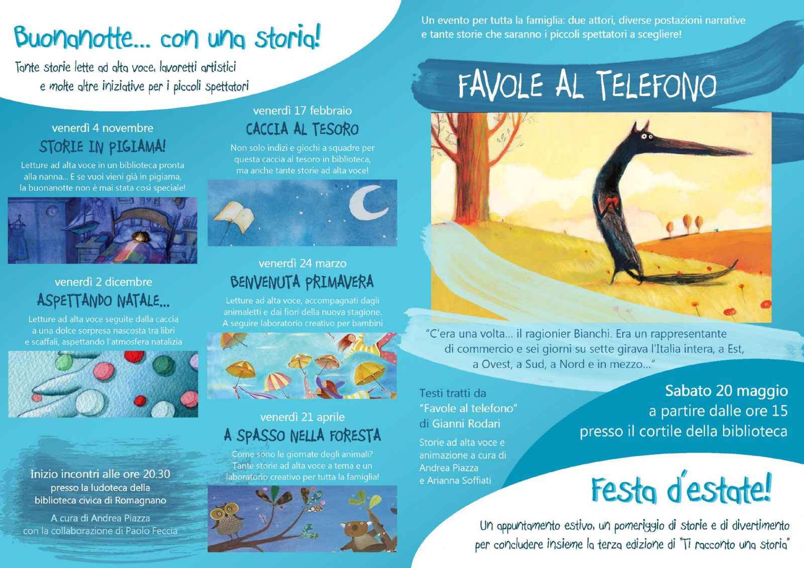 Ultimo appuntamento con “Ti racconto una storia”. Il progetto si rivolge ai bambini dell'infanzia e, in particolar modo, alla fascia dai 3-8 anni, con riferimento anche a età superiori. Al pomeriggio di sabato 20 maggio 2017 si terrà un momento di festa dal titolo “Favole al telefono”, tante storie e divertimento per concludere la rassegna in allegria con tante sorprese. Ingresso libero e gratuito.